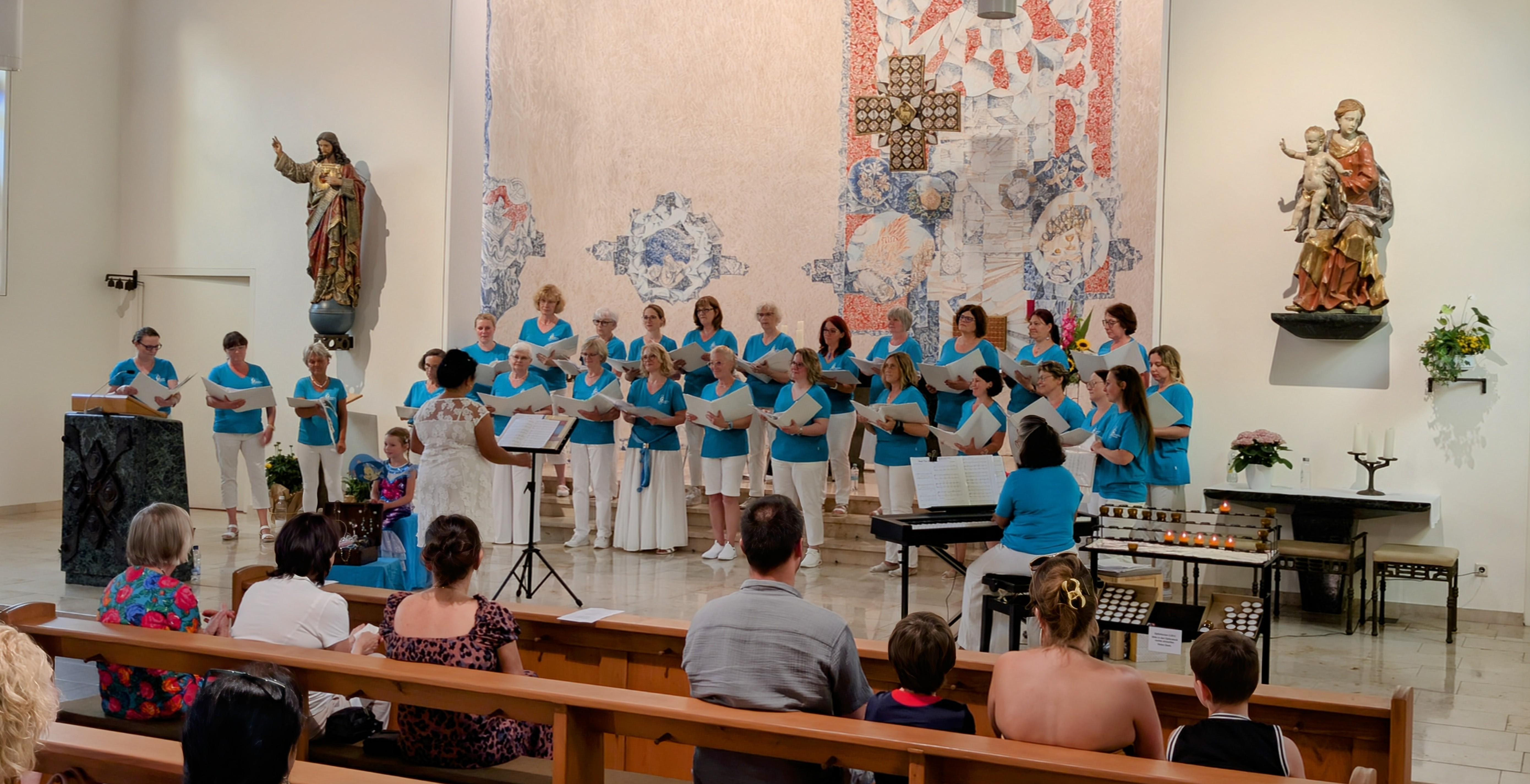 Als die Sängerinnen um 17 Uhr rechts und links der Bankreihen mit einem Medley aus dem Musical „Sister Act“ einliefen, wurden die Sängerinnen mit Chorleiterin Peny Bauer und Pianistin Renny Löffler mit einer fühlbar freudigen Erwartung empfangen. Denn trotzdem, dass nicht jeder Platz besetzt war, schuf das Publikum eine unglaublich lebendige und herzliche Atmosphäre, die den gesamten Saal erfüllte. Man spürte die Begeisterung in jeder Ecke.